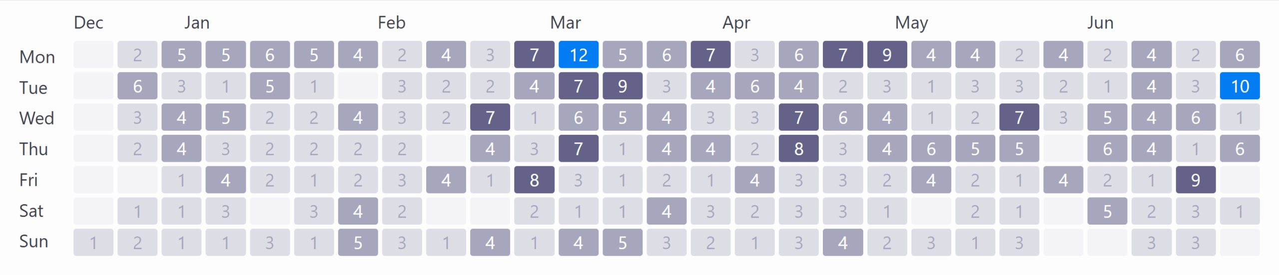 As of version 1.8.0, Entry Reports Pro for Gravity Forms introduces a heat map, inspired by the GitHub commit chart.