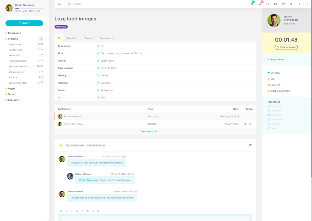 - Time recording: Log and edit time, and keep everything accountable.